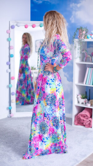 Rozcięcie od biustu w dół – lekko rozchodzi się przy chodzeniu, nie odsłaniając zbyt wiele, więc nogi są zawsze dyskretnie zakryte.