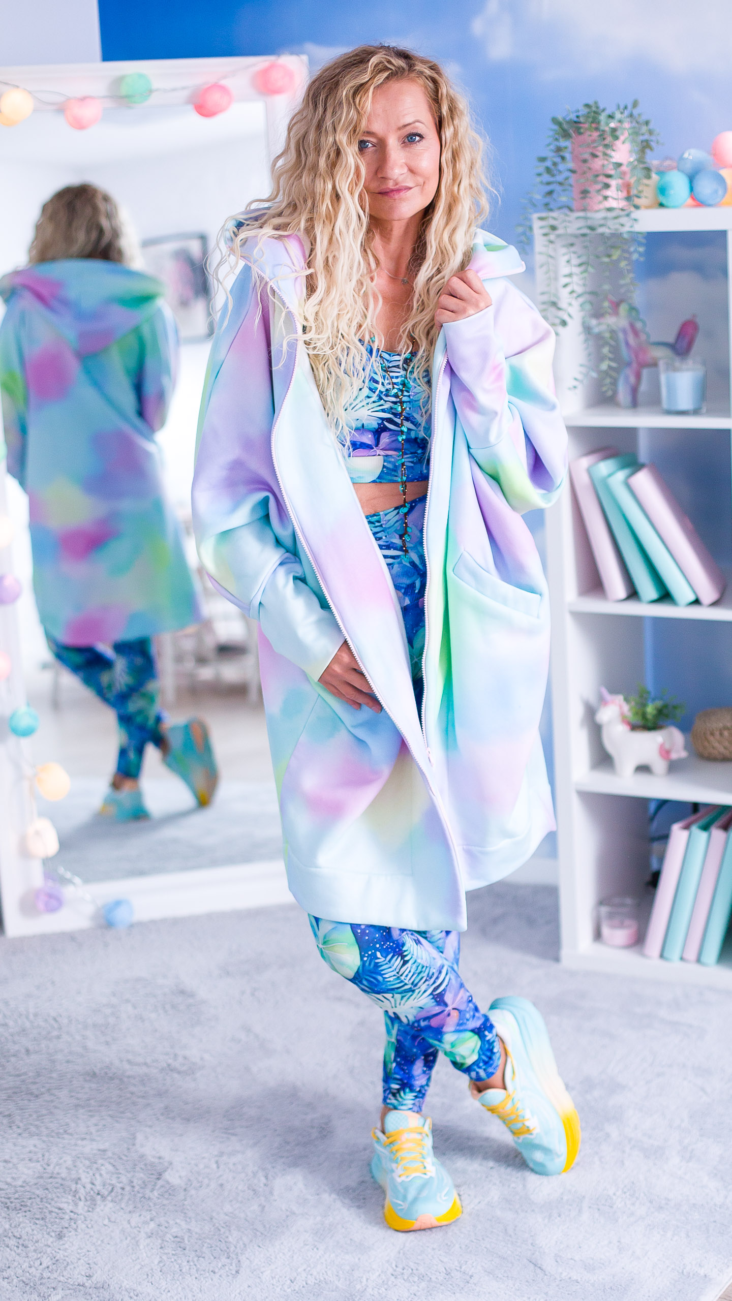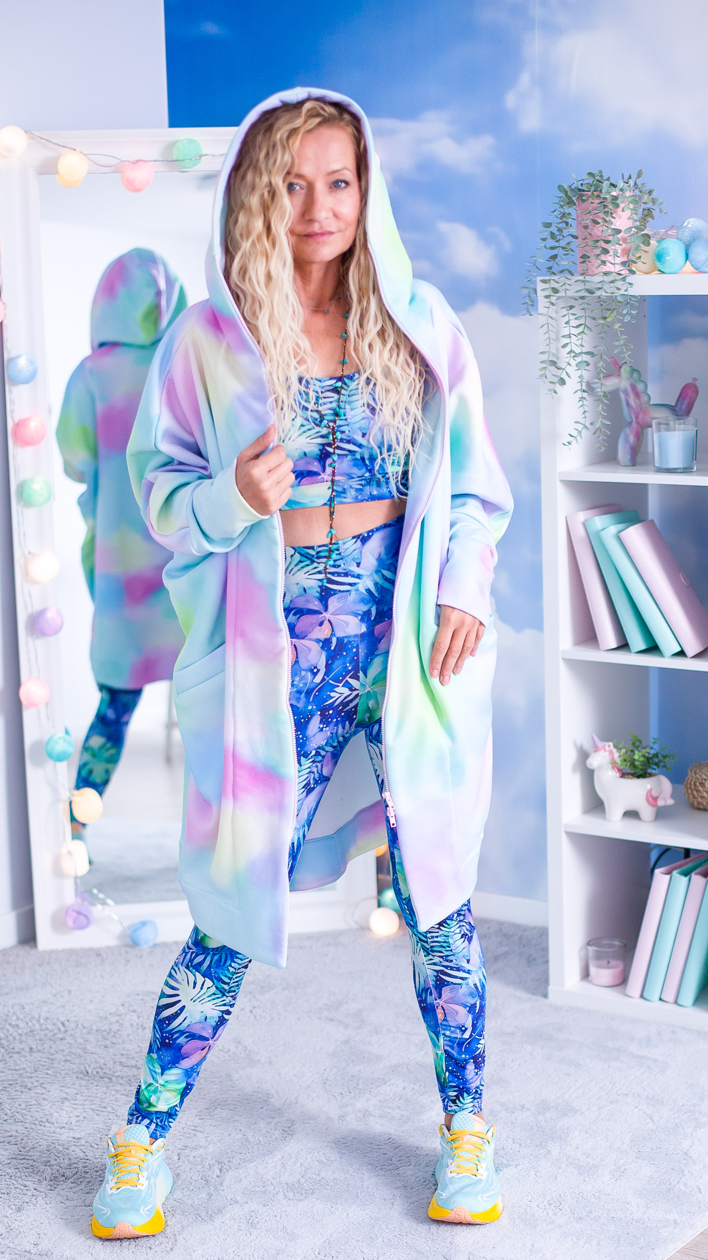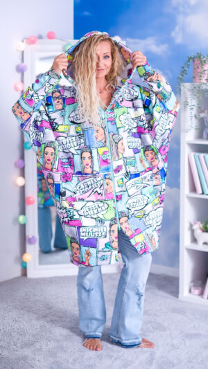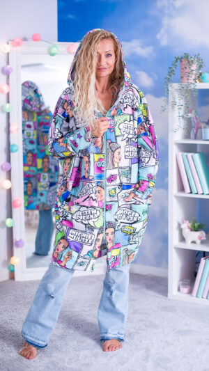 To oversize’owa bluza z podwójnym zamkiem, szerokimi rękawami i ogromnym kapturem, w którą wskakujesz i od razu czujesz się jak w swojej najlepszej wersji.