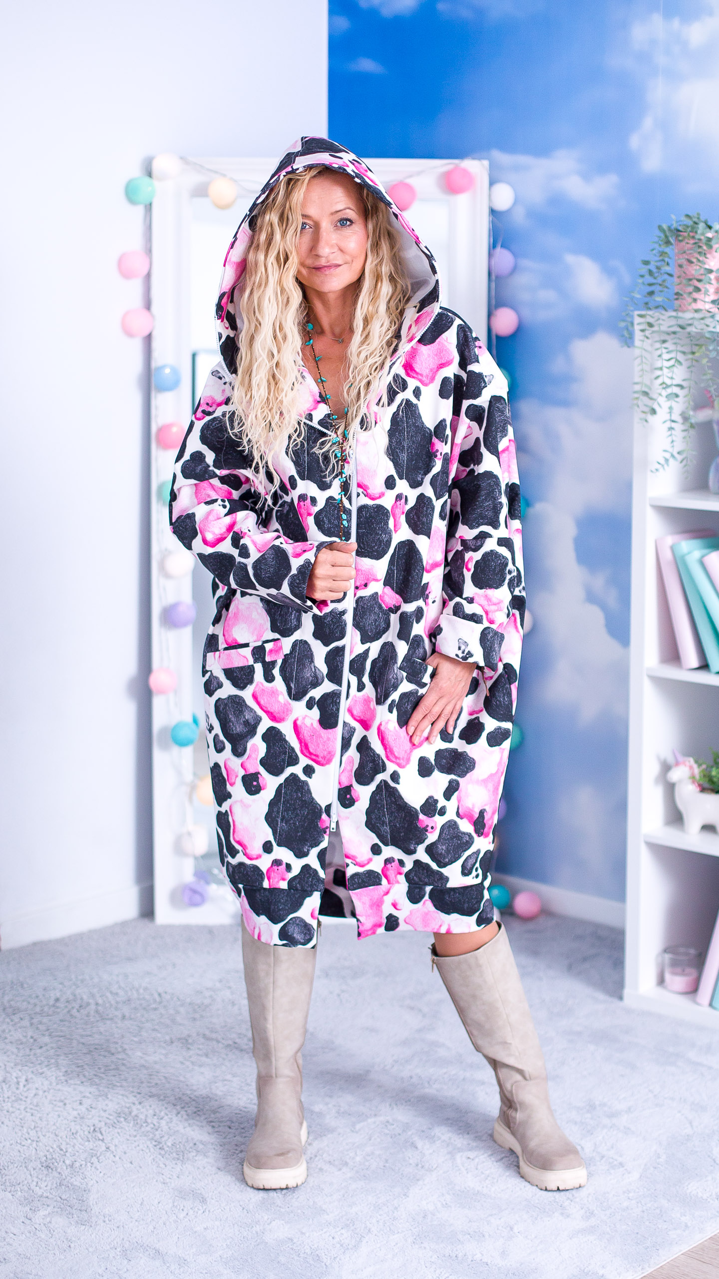 Długa, szeroka, z wielkim kapturem i podwójnymi rękawami, które możesz wywijać jak mankiet. Zero paska, pełna swoboda i zamek, który ogarnia temat jednym ruchem.